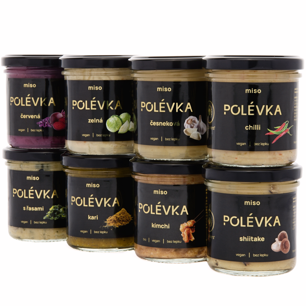 Naše miso polévky jsou české miso – fermentovaná pasta z lokálních surovin (hrách, ječmen, cizrna, rýže), která zraje v sudech měsíce až roky. Během fermentace ušlechtilá plíseň koji produkuje enzymy, které štěpí bílkoviny, tuky a sacharidy na jednodušší, lépe stravitelné formy. Výsledkem je jídlo s přirozenou chutí umami, plné prebiotik a bez jakýchkoliv přídatných látek.
