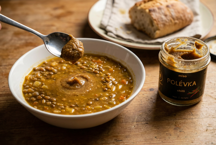 Do vývaru, čočkové, gulášovky, rajské — klidně do jakékoliv polévky, kterou právě máte na stole. Chuť se prohloubí způsobem, který je těžké popsat, ale snadno poznat. Milovníci pálivého u nás takto používají chilli miso polévku prakticky ke všemu.