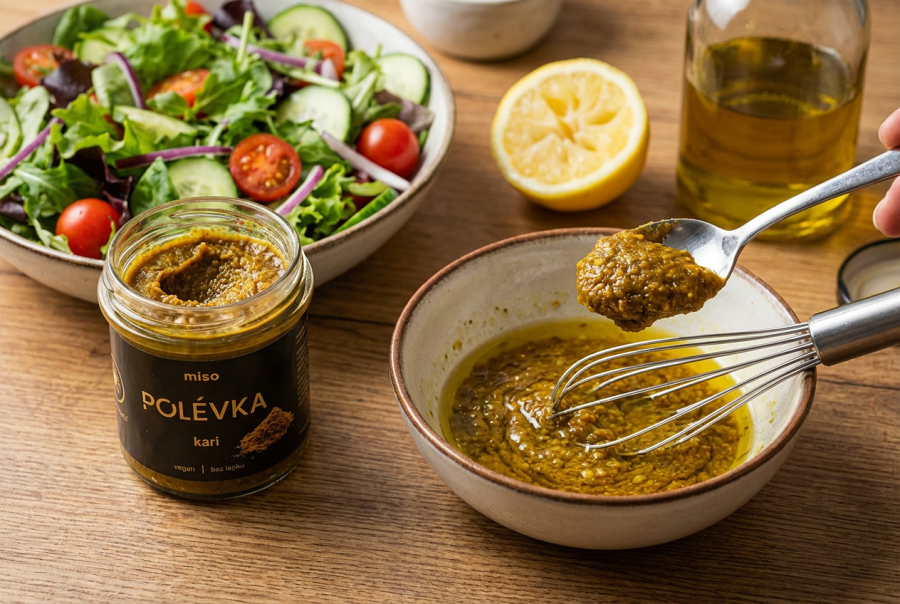 Vznikne zálivka s výraznou umami chutí, která povýší i jednoduchý salát z toho, co zbylo v lednici, na něco, co budete chtít opakovat. Funguje skvěle na listové saláty, ale i na pečenou zeleninu nebo cizrnu.