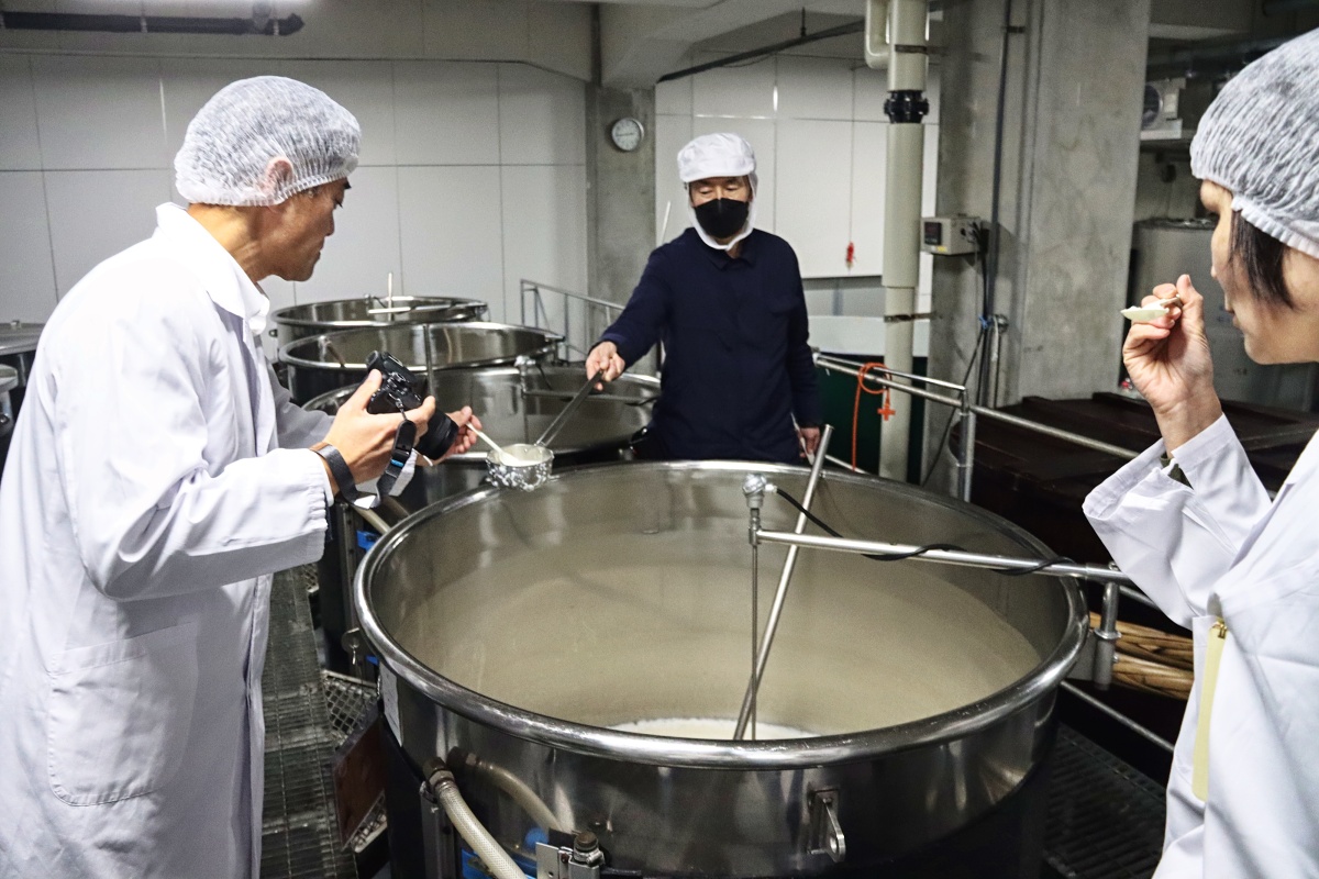 Potom jsme šli na prohlídku výrobny. To mě baví nejvíc. Zde jsme nejenom spoustu věcí viděli, ale také ochutnali. Přímo z tanků různě prokvašené moromi nebo třeba saké z trubek hned po filtraci (mimochodem takový filtrační stroj přes půl místnosti je super vůbec vidět 😊), které je ještě nepasterované. Fantastická chuť. Jako, nejsem velký fanda saké, ale to, co jsme ochutnali ve výrobě, byla neuvěřitelná pecka.