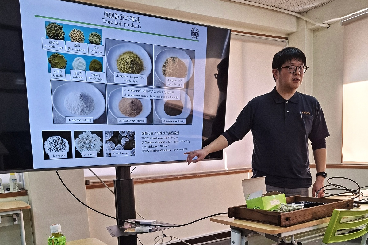 Návštěva začala téměř dvouhodinou prezentací se slidy na téma koji. A přednášel nám autor několik knih a studií s titulem „koji explorer“ na vizitce. No, jestli jsem si myslel, že o koji něco vím, tak zde jsem seděl, ani nedutal a kouřilo se mi od ruky, jak jsem se snažil vše si poznamenat. Naštěstí jsem slidy poté dostal elektronicky, stejně jako kontakt a nabídku konzultací stran správné volby koji spór na různé suroviny… Taky si už s japonským koji explorerem intenzivně mailuju 😊