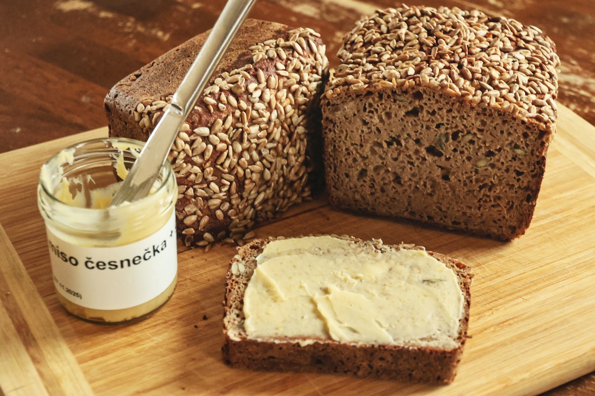 - 100 g semínek (slunečnice, len, dýně, sezam,…), slunečnici a dýňová semínka namáčím v hrnku minimálně 2 hodiny, klidně i těch 12 hodin, jak zraje před těsto + další na posypání