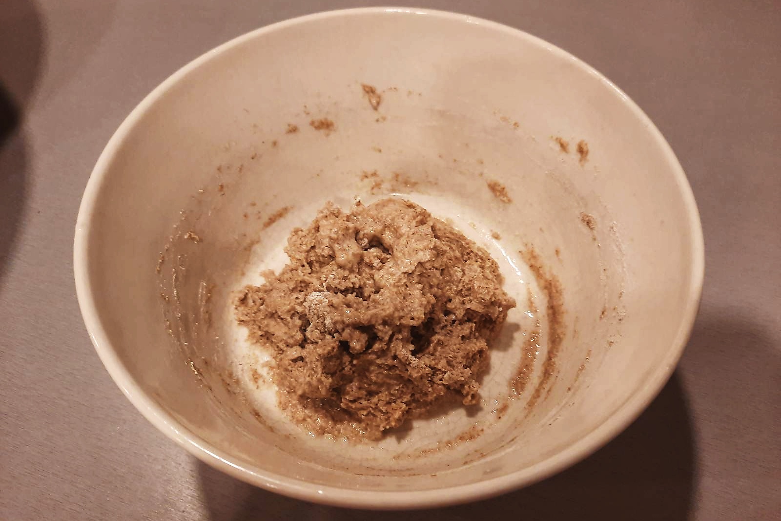 Lžíci, kterou jste odebrali z prvního kvasu současně smíchejte s ingrediencemi na druhý kvas, tedy s 50 g celozrnné žitné mouky, 50 g vody.