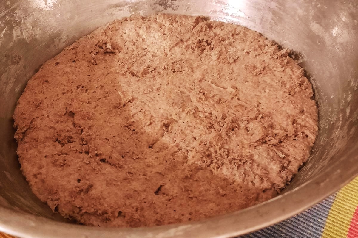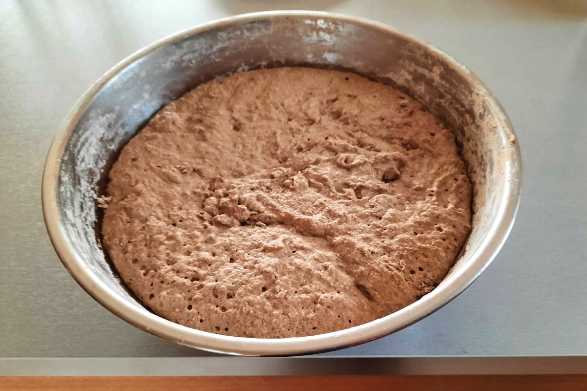 Přibližně 12 hodin předem si připravte "první" kvas smícháním dvou startovacích lžic žitného chlebové kvasu, 150 g žitné celozrnné mouky, 150 g vody.