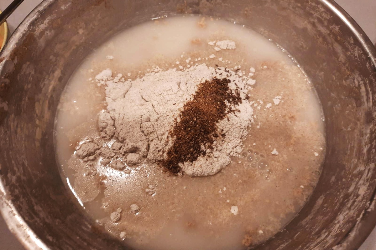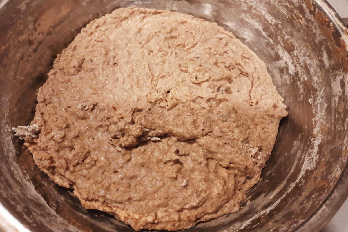 Na před těsto smíchejte zbytek kvasu s 240 g vody, 310 g žitné celozrnné mouky.