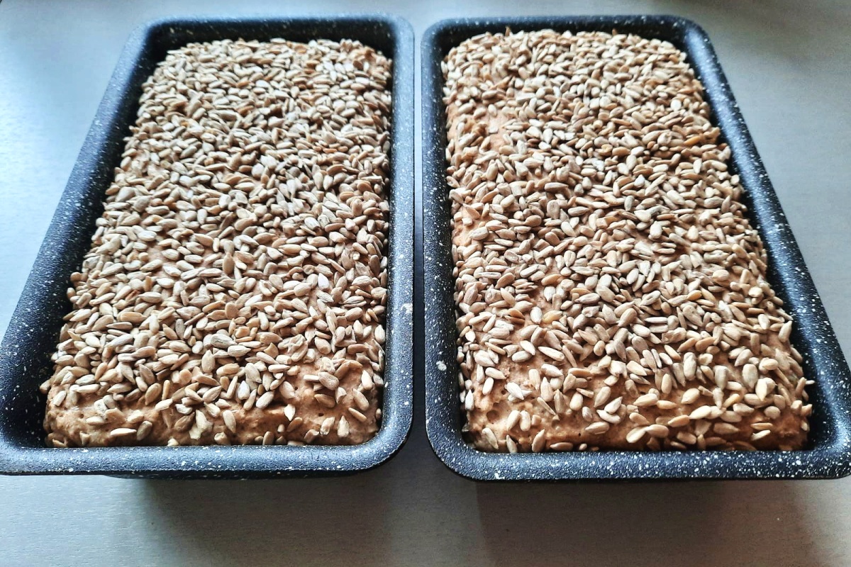 Vykynuté těsto rozdělte rovnoměrně do dvou vymazaných a slunečnicí a mákem vysypaných chlebových forem (nebo jedna větší + formičky na tartaletky, ve kterých jdou udělat dalamánky nebo do zapékacích misek), nijak jej ale neutemovávejte, jen rozdělte a lehce zarovnejte.