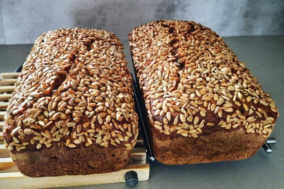 Posypejte celý povrch slunečnicovými semínky a nechte ještě naposledy částečně vykynout. V tomto čase bývá těsto už dost aktivní a může to trvat pouze půl hodiny, ale třeba i 1,5 hodiny, v závislosti na teplotě prostředí a také Vašem kvásku. Je potřeba hlídat, aby těsto nešlo moc přes formu.