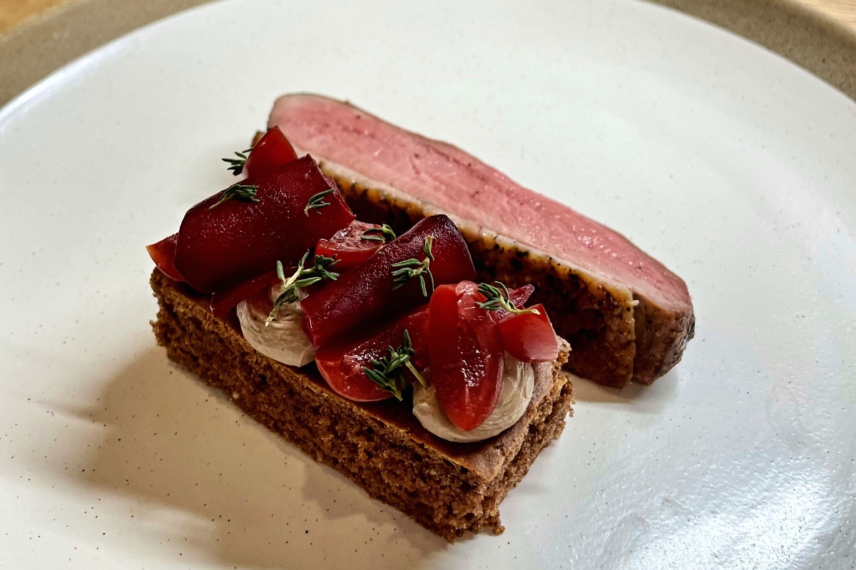 Kachní prso v koji, višně v praoctu, perník, paštika